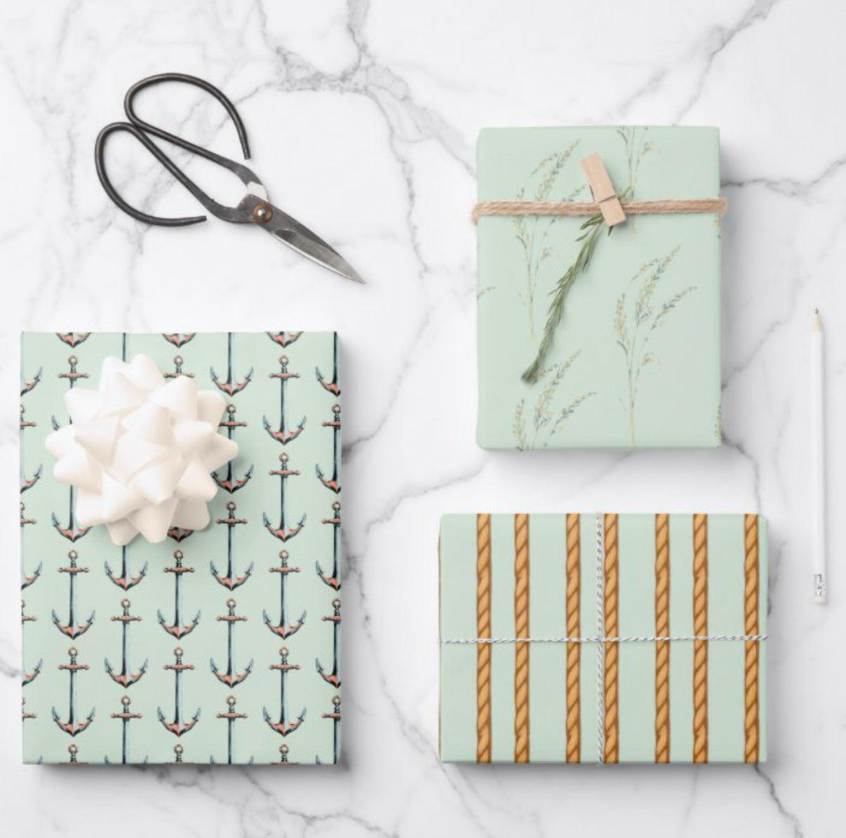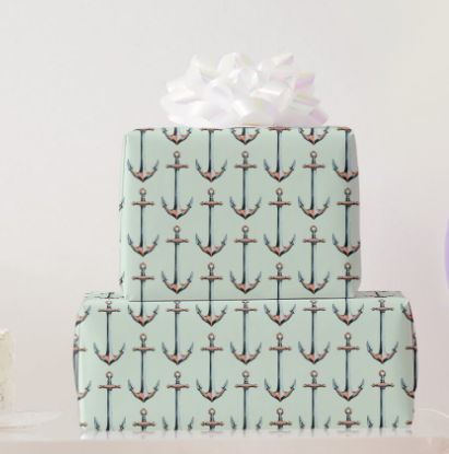 Wrap your favorite gifts in cheerful anchors paired with our sea oats toile pattern and whimsical rope stripe. Designed to coordinate with other patterns in the Cottage Collection.