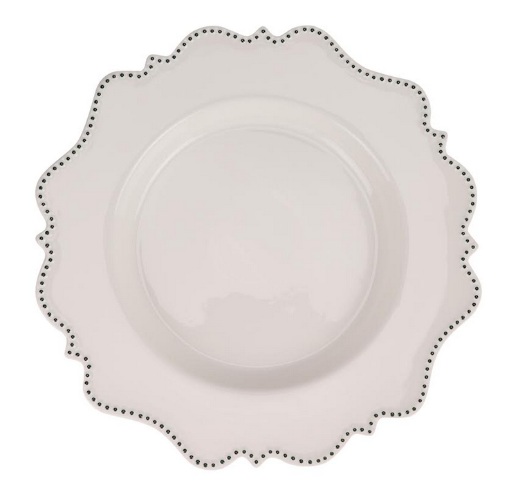 Elevate your dining experience with our elegant Ivory with green Beaded Scalloped Charger. This exquisite piece features a classic ivory base adorned with a striking navy beaded scalloped edge, combining timeless sophistication with a modern touch. Perfect for adding a refined finish to your table settings, this charger adds a layer of charm and style to any occasion.