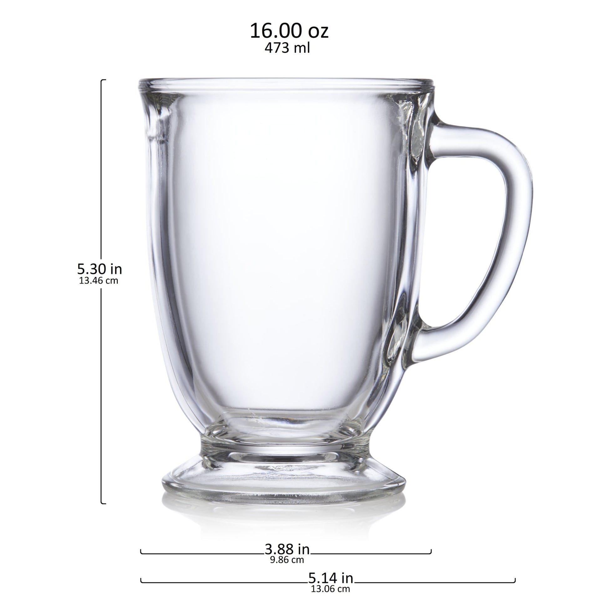 - Includes 6, 16-ounce glass mugs (5.14-inch diameter x 5.3-inch height)