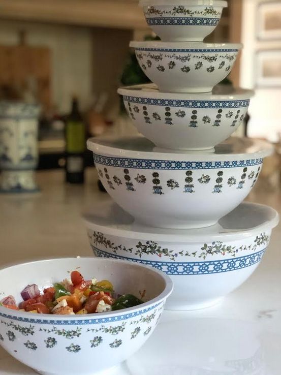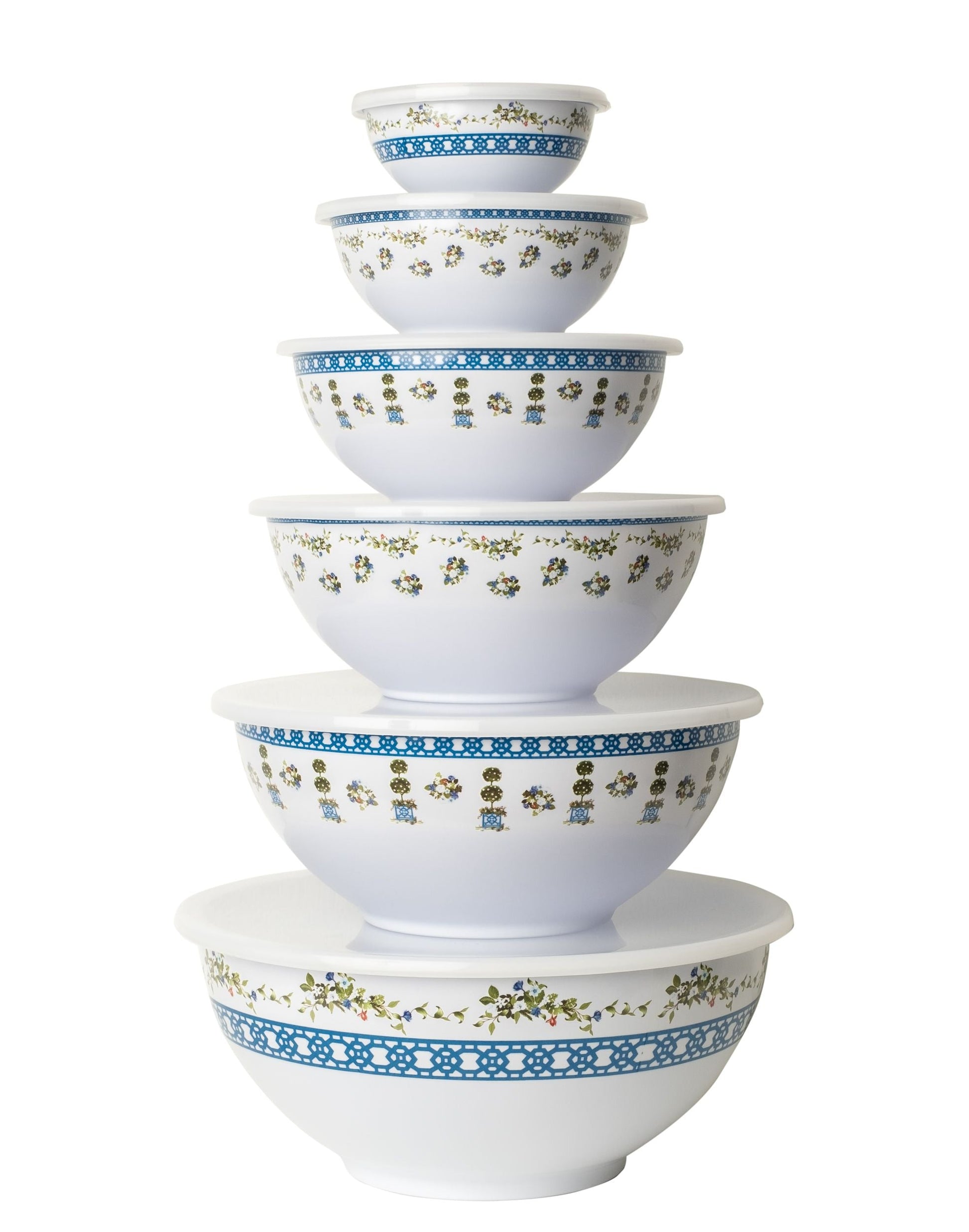 Enhance your kitchen with the Trellis and Topiary Mixing Bowls with Lids. This set of six bowls features an elegant blue and white design with soft, multi-colored floral accents, blending style with practicality.